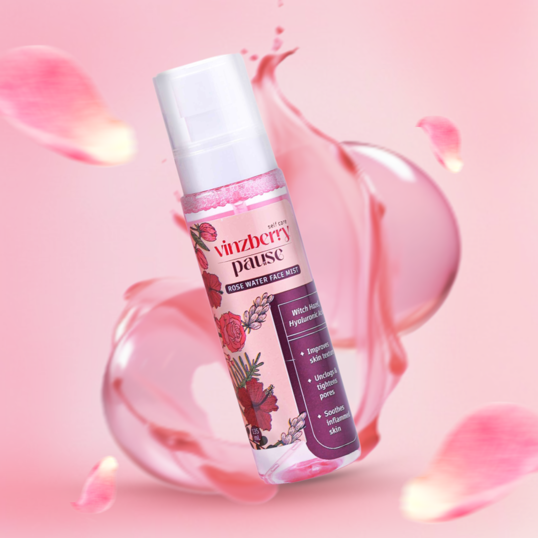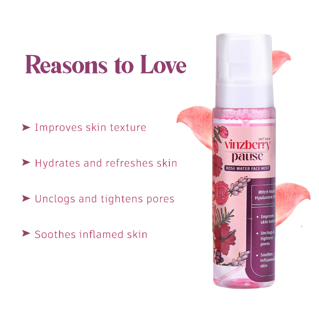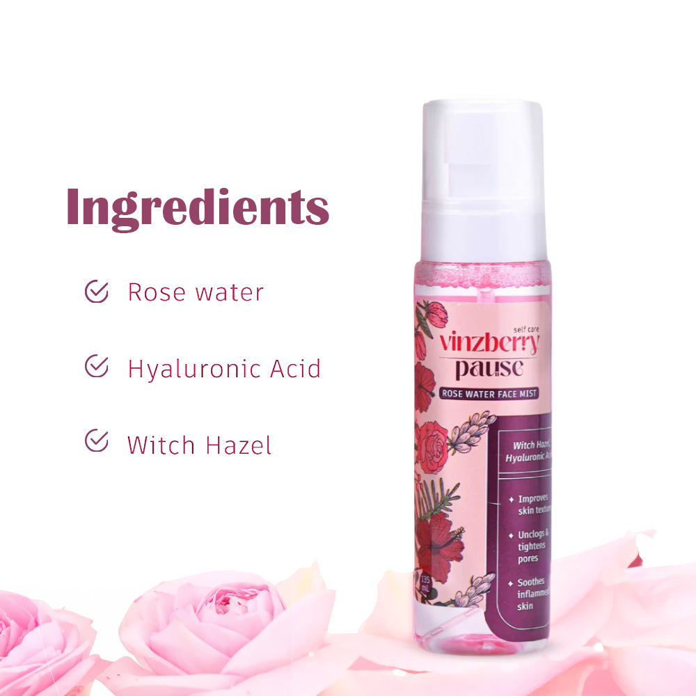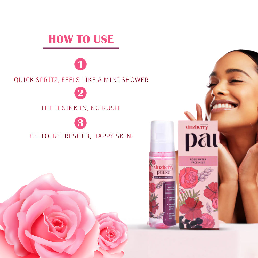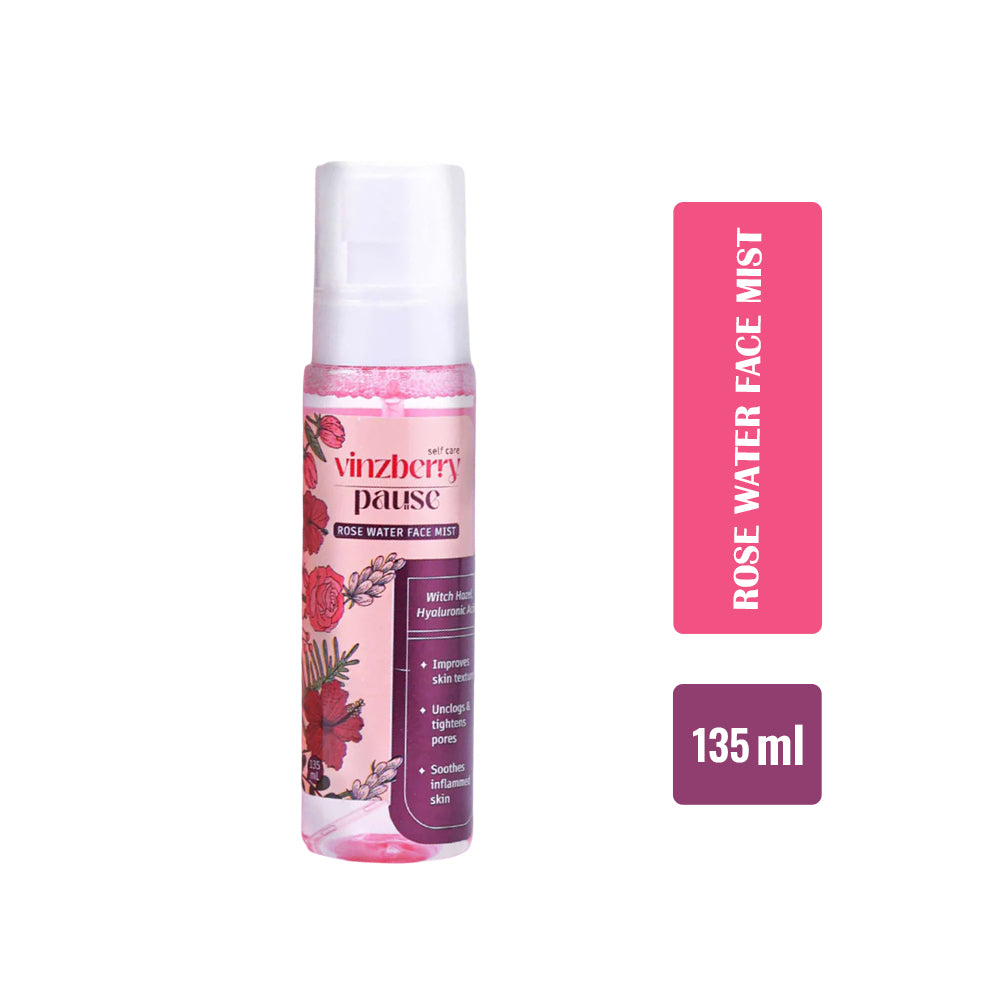 Vinzberry Pause Rose Water Face Mist is an expertly formulated product that uses 100% natural rose water to hydrate, refresh, and calm your skin. With anti-inflammatory properties and a gentle rose scent, it's the perfect addition to your skincare routine. Feel confident and rejuvenated with Vinzberry Pause Rose Water Face Mist.
